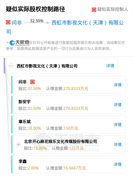 天眼查显示,西虹市影视的最大股东为两位影片导演闫非和彭安宇(彭大魔),分别持股32.5%;而开心麻花持股西虹市影视15%,位列股东第四位。其他股东还包括章乐斌和李鑫。