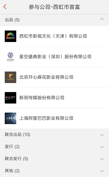 而猫眼专业版显示,《西虹市首富》背后有五个出品方,分别为:西虹市影视文化(天津)有限公司(以下简称“西虹市影视”)、星空盛典影业(深圳)股份公司(以下简称“星空盛典”)、北京开心麻花影业公司、新丽传媒股份有限公司、上海阿里巴巴影业有限公司。而除了5家出品方之外,影片还有多达10家的联合出品方。