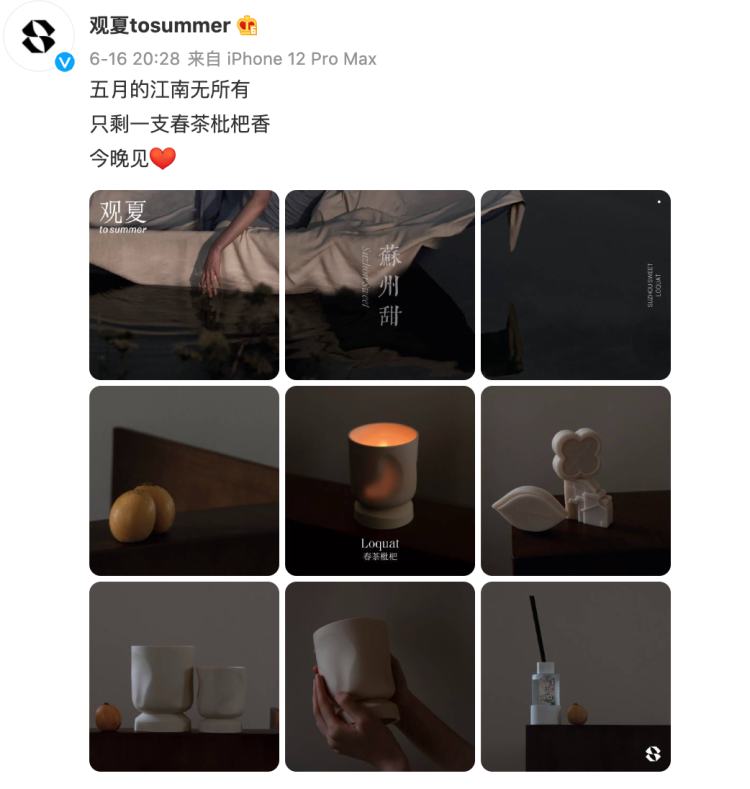 在观夏的内容输出中,甚至是新品文案中,经常不直接写产品,而是写产品故事,以建立一种东方想象,所以里面经常有一些文人雅士的诗意表达。比如像“千山隔书信慢,今日月明花香,予你共赏”“迎面风雨旧相识,遥知故园暮夏深”等。