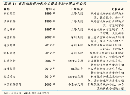 在A股、港股和中概股市场,至少出现过10 家以软件外包为主要业务的上市公司。然而,2012 年以来,软件外包上市公司纷纷向行业解决方案、IT 咨询、云计算、大数据等方向转型。时至今日,只有中软国际一家上市公司仍以软件外包为核心业务和战略立足点。虽然一些公司的收入组成中还有较大比例的软件外包部分,但战略中心都已经发生了偏离。