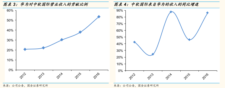 2012-2015 年,华为对中软国际营业收入的贡献比例从21%上升到54%,占据了半壁江山;来自华为的收入的复合增速为59%,最高的年份甚至达到88%。除了带来直接收入,华为还使得中软国际的软件外包团队迅速扩大,从而具备了规模效应,在争取其他客户时更有利了。