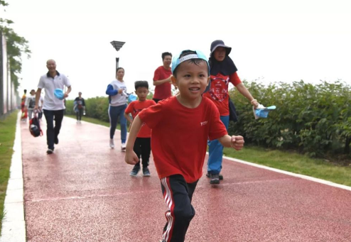 广西南宁市兴宁区卓越幼儿园亲子马拉松比赛在该市那考河湿地公园举行。萌娃们和家长在4公里的竞速比赛中,同心协力 周华 摄