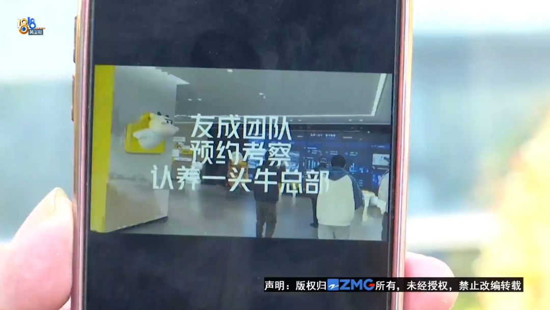 视频的标题是“友成团队预约考察认养一头牛总部”,投资者介绍,友成团队是谁他们也不清楚。视频显示,多名投资者在