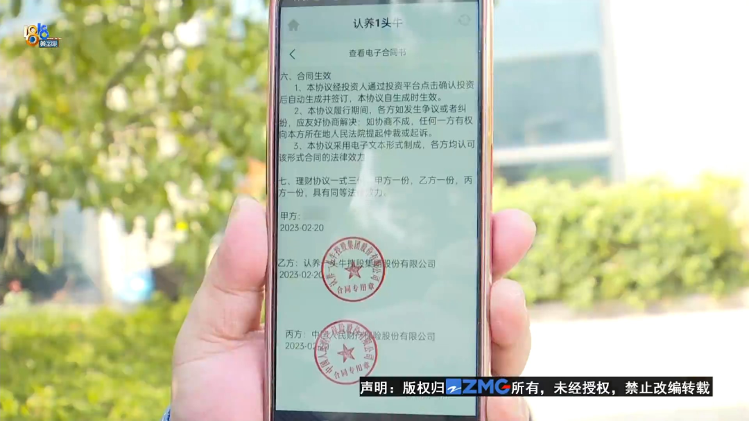 ,就是在“认养一头牛”这个APP上。现在“认养一头牛”公司说,不是他们的APP,但是出示的章,以及线上认养、线下养殖,包括牧场,都是真实的。