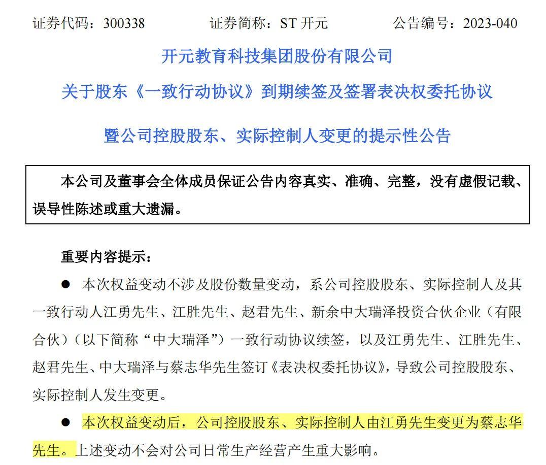 4月15日,ST开元公告称,通过签署表决权委托协议的方式,上市公司控股股东、实际控制人将变更。