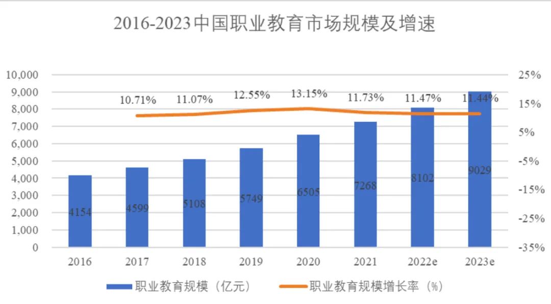数据显示,职业教育在政策的推动下驶入快车道,在政策利好的环境下,职业教育市场规模将进一步扩大,到2023年职业教育市场规模预计超过9000亿元。