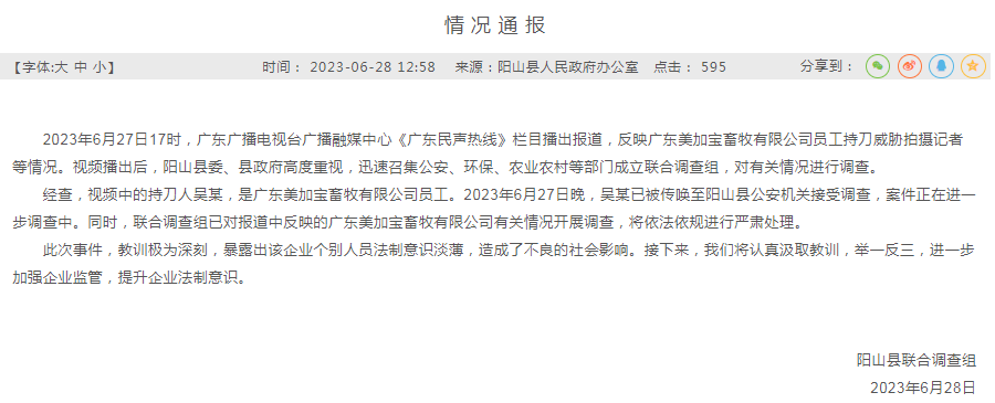 2023年6月27日17时,广东广播电视台广播融媒中心《广东民声热线》栏目播出报道,反映广东美加宝畜牧有限公司员工持刀威胁拍摄记者等情况。视频播出后,阳山县委、县政府高度重视,迅速召集公安、环保、农业农村等部门成立联合调查组,对有关情况进行调查。