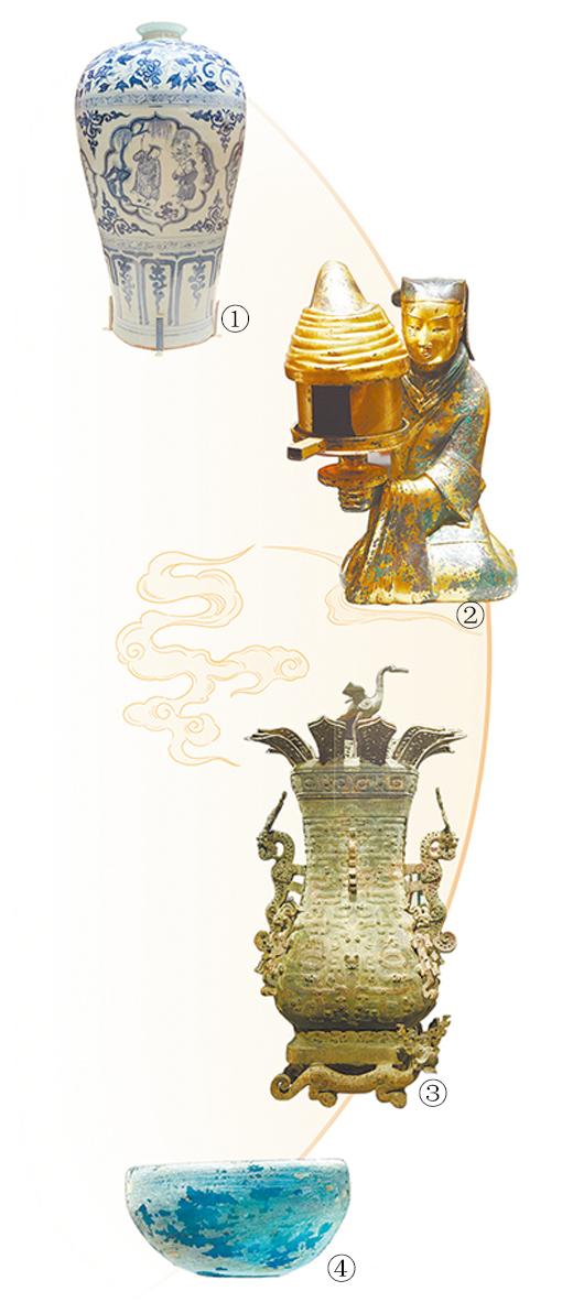 图①②分别为在“大美亚细亚——亚洲文明展”展出的元青花四爱图梅瓶和长信宫灯。 金瑞国供图 图③为河南博物院藏莲鹤方壶。 张志刚摄 图④为大同市博物馆藏北魏蓝色半球形玻璃泡。 张志刚摄
