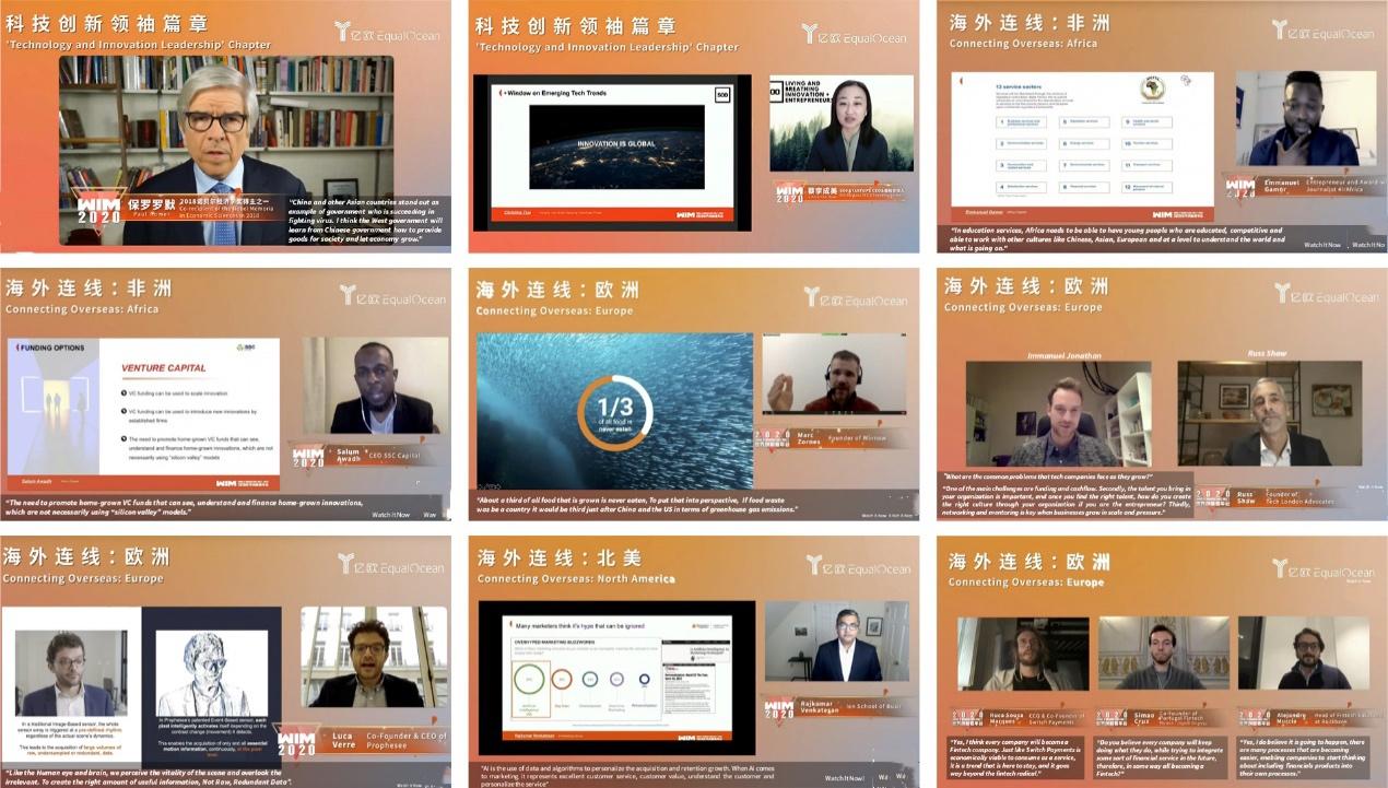 此次WIM2020大会在中国和亚太时区进行1场科技创新领袖主篇章+7大主题篇章,在美洲、欧洲和非洲时区进行3场全球连线篇章。1+7分为科技创新领袖、科创驱动价值投资、疫情后重启新消费、科技出行全球竞赛、产业互联工业智能、全球疫情下的科技医疗产业、房地产的科技魅力、金融科技重构全球协作体系篇章。并且特邀到非洲、欧洲和北美三大海外地区的商界精英进行同步分享和连线,带来了海外市场的发展情况和最新趋势。