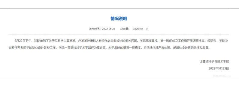 央广网北京5月25日消息(记者郭佳丽)近日,“论文代写”成生意引发热议。有网友在“西安电子科技大学吧”发文称,该校两名大四学生找其有偿代做毕业设计,做完后利用平台交易漏洞找借口跟其要钱。23日,西安电子科技大学计算机科学与技术学院发布情况说明,决定暂停两名涉事同学的毕业设计答辩工作,对于反映的情况一经查实,将依法依规严肃处理。
