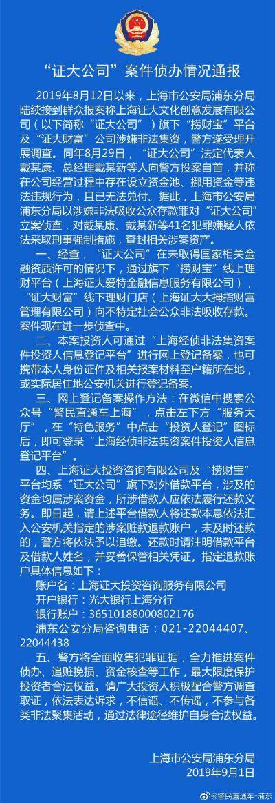 9月1日,上海市公安局浦东分局官方微博“警民直通车-浦东”发布《“证大公司”案件侦办情况通报》称,8月12日以来,陆续接到群众报案称证大公司旗下网贷平台“捞财宝”线上理财平台(上海证大爱特金融信息服务有限公司)及“证大财富”公司涉嫌非法集资,警方遂受理开展调查。8月29日,“证大公司”法定代表人戴某康、总经理戴某新等人向警方投案自首,并称在公司经营过程中存在设立资金池、挪用资金等违法违规行为,且已无法兑付。据此,上海市公安局浦东分局以涉嫌非法吸收公众存款罪对“证大公司”立案侦查,对戴某康、戴某新等41名犯罪嫌疑人依法采取刑事强制措施,查封相关涉案资产。