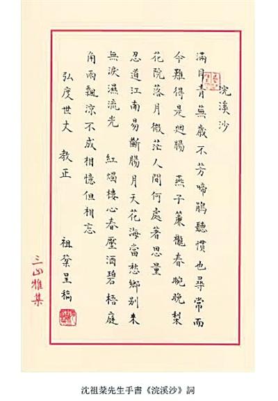 沈先生既以词受知于汪东,尤以词为生命。曾自言:“受业向爱文学,甚于生命。曩在界石避警,每挟词稿与俱。一日,偶自问,设人与词稿分在二地,而二处必有一处遭劫,则宁愿人亡乎?词亡乎?初犹不能决,继则毅然愿人亡而词留也。”(《上汪方湖、汪寄庵两先生书》)其情至真至切,读之令人泪洒衣襟!