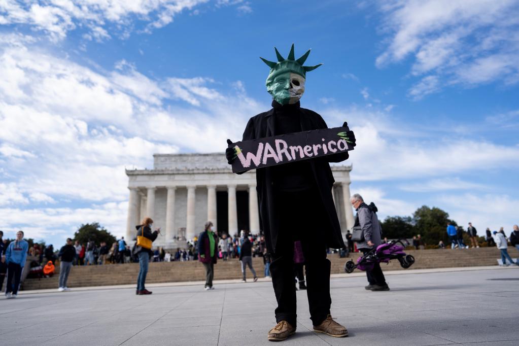 2023年2月19日,在美国首都华盛顿,一名抗议者手举标语在林肯纪念堂前参加反战集会。新华社记者刘杰摄