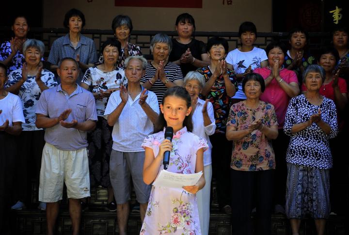 温哥华国际音乐学院学生代表Sarah Gerrie在开营仪式上代表加拿大学生发言,她告诉大家:“今年6月底,我和《吉祥三宝》中的吉祥妈妈、吉祥爸爸、吉祥姐姐,还有乌达木哥哥在温哥华同台演唱《吉祥三宝》和《春天来了》!我也被称为加拿大版的吉祥宝贝。今年是中加两国的旅游年,我非常荣幸能代表加拿大小朋友来到美丽的江山市,参加国际微电影夏令营。江山的风景好美,让我更加喜爱中国。我们漂洋过海从加拿大来,希望通过这次交流活动增进加拿大小朋友对中国博大精深传统文化的了解,并将中国文化传承下去!这次的微电影剧本真的太有意义了!我想了解中国的孝道,回去后要分享给在温哥华的朋友们!因为我的梦想是成为一名国际文化交流大使!”