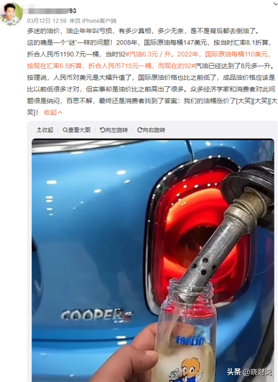 老百姓对算法质疑声不断,但并没有改变油价调整不透明的本质,今年6月,有位博主拿2008年的油价跟当时的油价相比,2008年油价147美元/桶,国内6.22块人民币每升,国际油价随后下跌到110美元,但国内油价却神奇地不断上升,最高甚至突破10块人民币。