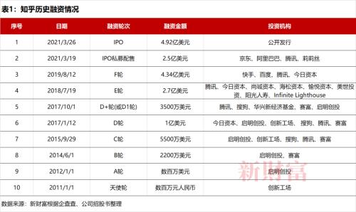 知乎A轮、B轮、C轮、D轮、D1轮、E轮及F轮融资后估值分别为2990万美元、1.32亿美元、3.751亿美元、9.185亿美元、10亿美元、24亿美元及34亿美元。